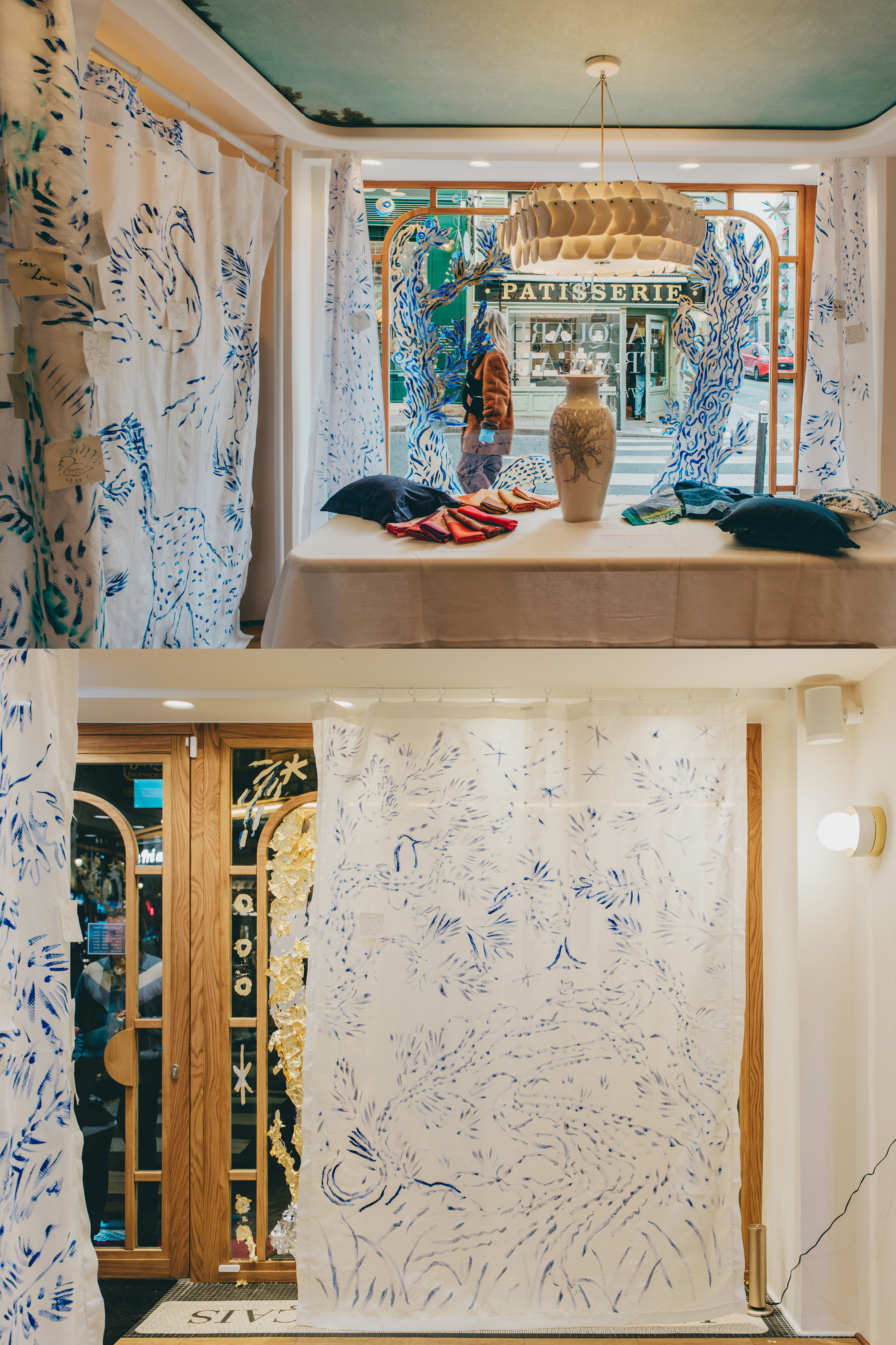 Spread across large drapes and bedding designed to resemble a landscape, the installation reveals a discreet and poetic fauna that seems to emerge gently from a snowy setting. The windows extend this dreamlike atmosphere with subtle lighting effects, inviting passersby to slow down and enter this hushed universe.