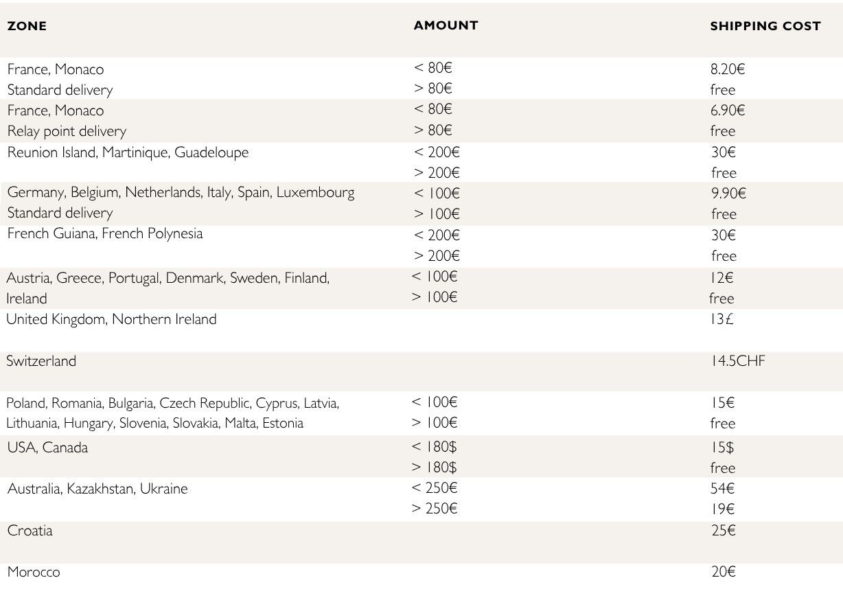 The online sales of products listed on the website is reserved for buyers who request for delivery in mainland France, Corsica and all countries with an open access to the website.